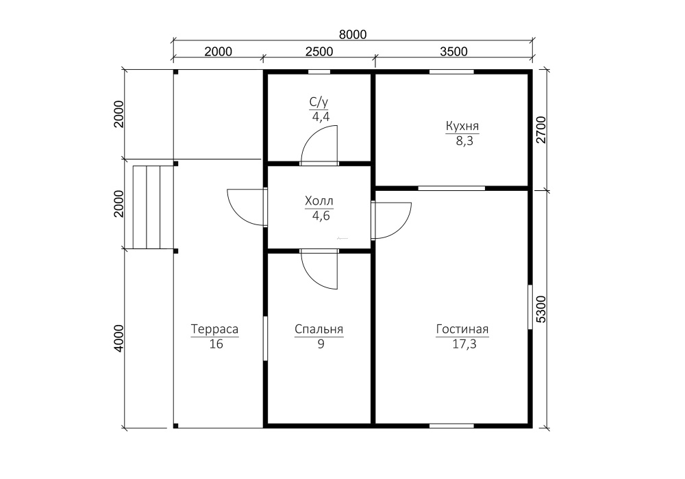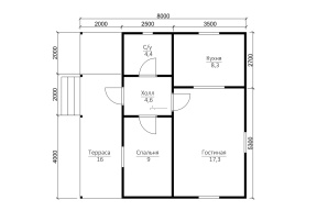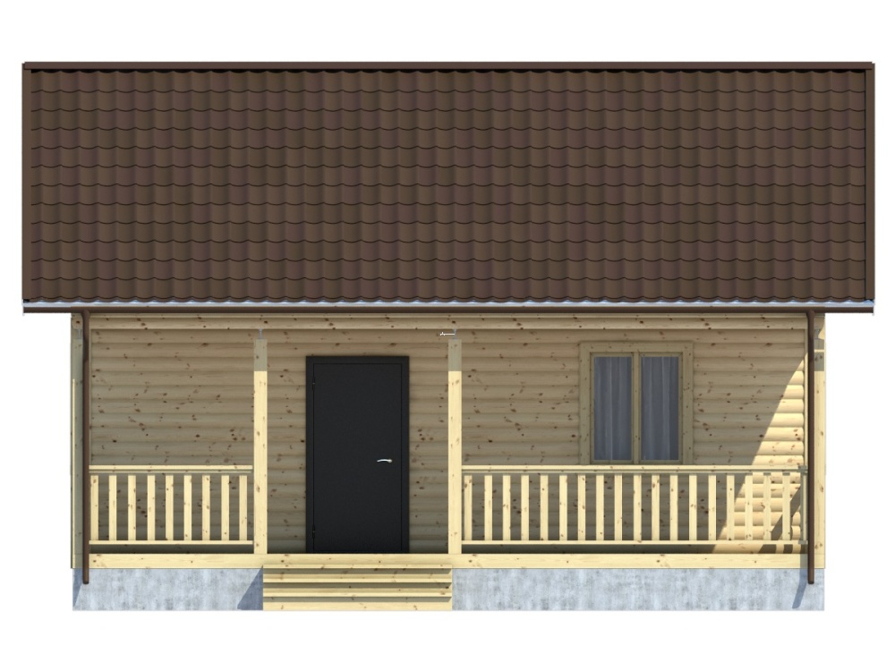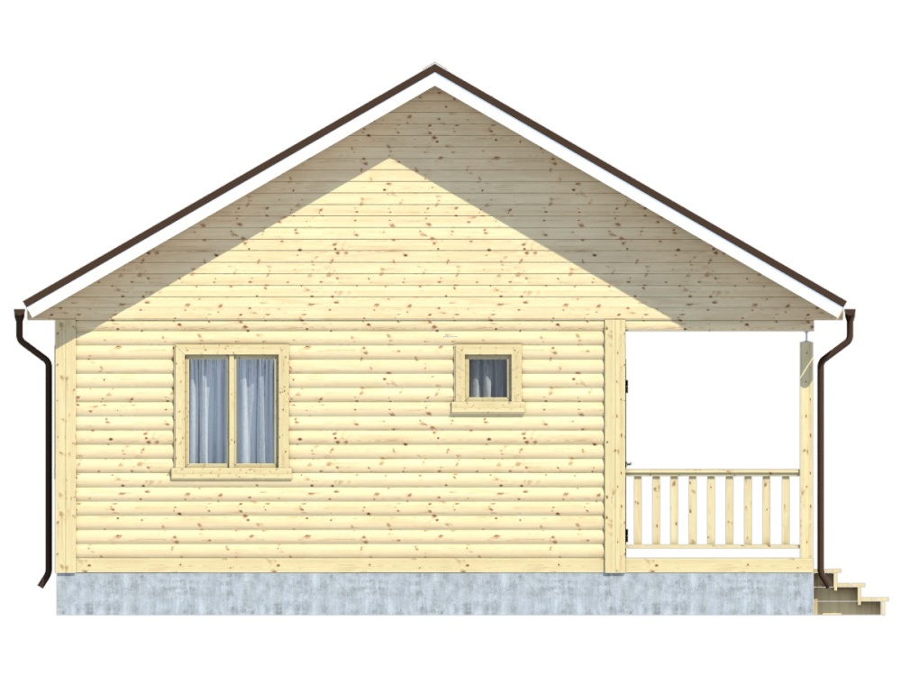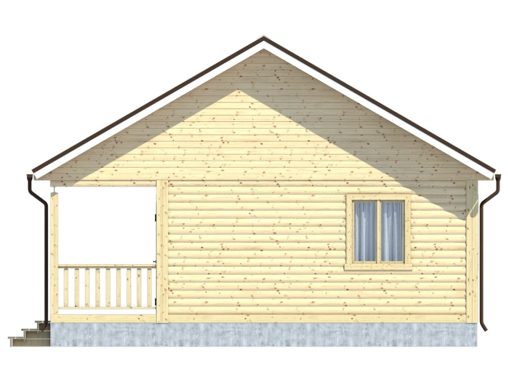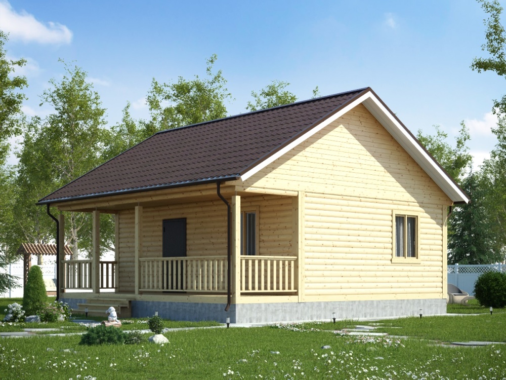 Проект одноэтажного дома из бруса с большой террасой, общая площадь которого составляет 44 кв.м., – это эксплуатационная надежность, функциональность и изысканный дизайн.